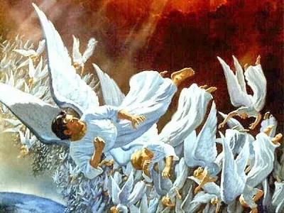 Foi aí que a batalha começou;e Miguel,que pertencia aos anjos serafins,imediatamente pegou sua espada,e lutou com ele e os anjos que passaram para seu lado.(diz-se que vários anjos dos nove coros angelicais,passaram para o lado do líder satânico)