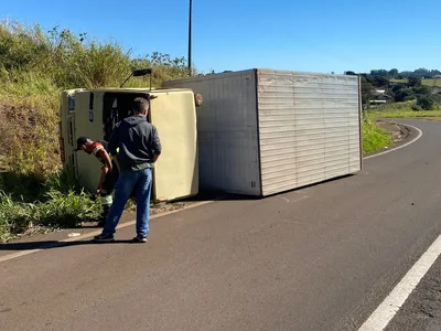 Um caminhão baú, modelo Agrale 7000, tombou na rodovia BR-376 (Rodovia do Café), próximo ao Distrito da Vila Reis, entre Apucarana (PR) e Califórnia (PR). (Veja o vídeo)