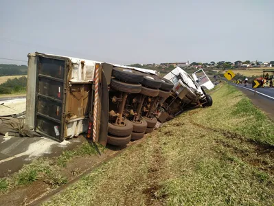 O caminhão estava carregado com pó de gesso que fiou espalhado na rodovia. O motorista não sofreu. A Polícia Rodoviária Federal (PRF) foi chamada.