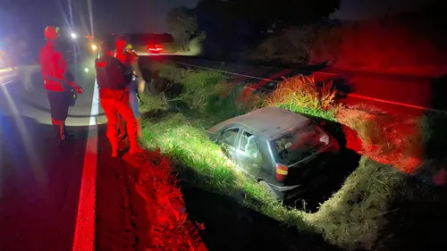 Um carro caiu na canaleta entre as pistas da BR-376, em Apucarana, na saída para Cambira. O acidente aconteceu na noite desta terça-feira (20) e mobilizou equipes do Corpo de Bombeiros, Polícia Rodoviária Federal (PRF) e Grupo CCR.
