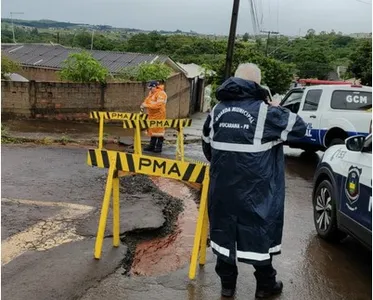 A Guarda Civil Municipal (GCM) de Apucarana interditou, na tarde deste domingo (14), a Rua Azen Said Mohd, no Jardim Catuaí, após a formação de um buraco na via em decorrência das chuvas.