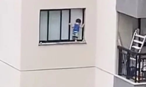 "O garotinho está na janela, moça. O filho da senhora está na janela. Vai para o quarto, gente. Misericórdia", grita uma pessoa que está num apartamento em frente e grava a cena.