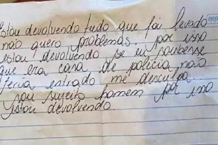 O arrombamento aconteceu no Bairro Anchieta, em Belo Horizonte, Minas Gerais. “Estou devolvendo tudo que foi levado, não quero problemas. Se soubesse que era casa de polícia, não teria entrado. Me desculpa. Sou sujeito homem, por isso, estou devolvendo”, diz o bilhete escrito à mão. Todos os objetos que haviam sido levados foram deixados no jardim da casa e encontrados na segunda-feira (12).