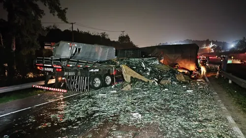 Um caminhão carregado com vidros tombou na BR-277, em Campo Largo, na Região Metropolitana de Curitiba, e causou um engavetamento com seis veículos na noite desta terça-feira (10). O acidente aconteceu na altura do quilômetro 105 e causou interdição na pista sentido Curitiba – Ponta Grossa por cerca de sete horas. Conforme informações, a rodovia só foi liberada por volta das 5h30 desta quarta (11).