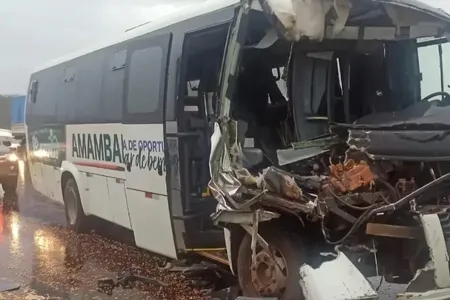 Com o impacto da batida, a parte da frente do coletivo teve diversos danos. Já na parte de trás da carreta ficou danificada e houve derramamento de parte da carga de milho.