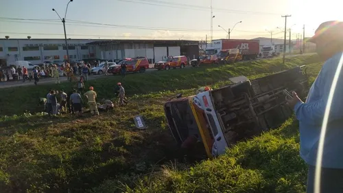 Um ônibus escolar com 25 crianças a bordo tombou após colidir contra um caminhão no final da tarde desta segunda-feira (21) na BR-277, em São José dos Pinhais, na Região Metropolitana de Curitiba.