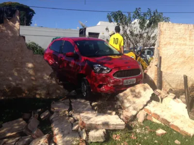 Um carro bateu no muro de uma casa após colidir com outro veículo, na manhã desta sexta-feira (16) em um cruzamento no Núcleo Habitacional João Goulart, em Apucarana. Uma mulher e uma criança ficaram feridas.