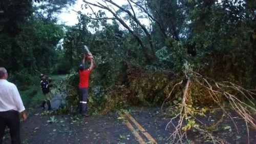 Uma árvore caída na Rua Rafael Sorphile, próximo à Lagoa do Schimidt, na região do Jardim Marissol, na zona leste de Apucarana, provocou acidente de trânsito e exigiu mobilização de equipe do Corpo de Bombeiros no início da manhã deste sábado (24).