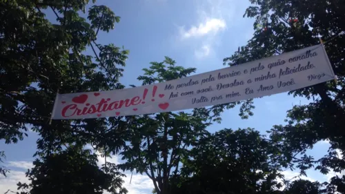 Homem estende faixa com pedido de perdão para tentar reatar casamento