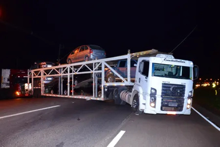 Segundo a Polícia Rodoviária Federal (PRF), o caminhão-cegonha carregado de veículos sinistrados (batidos) fez o retorno sentido a Londrina nas imediações da Frimesa, mas ficou preso em uma lombada.
