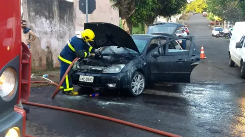 A equipe foi até a Rua Marechal Deodoro, na Vila Santa Rosa, combater um incêndio no motor de um Ford Focus.