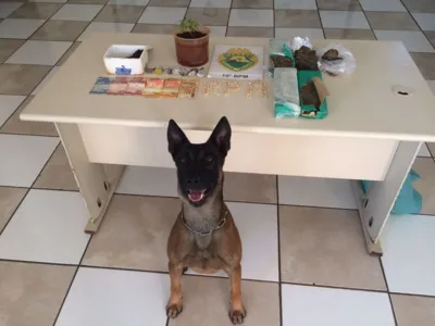 Na casa do suspeito, a PM encontrou mais cinco tabletes de maconha pesando 2,130 kg além de 115 g da mesma droga localizadas com ajuda do cão farejador e um pé de cannabis.
