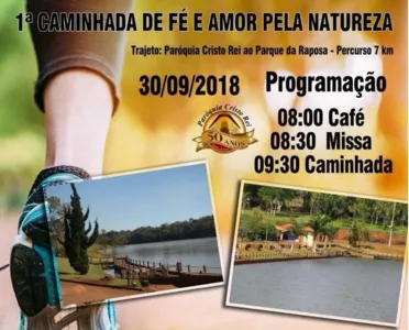 A Pastoral do Meio Ambiente e a Paróquia Cristo Rei, de Apucarana realizam no dia 30 de setembro a “1ª Caminhada de Fé e Amor pela natureza”. A programação tem início a partir das 8 horas na sede da paroquia, onde os participantes serão recepcionados com café da manhã, seguido de missa e então saída para a Caminhada. O percurso de 7 quilômetros termina no Parque da Raposa.