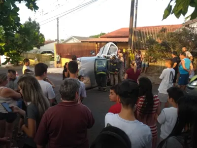 Um carro capotou após uma colisão na tarde desta segunda-feira (22), em um cruzamento no Núcleo Habitacional Osmar Guaraci Freire em Apucarana.