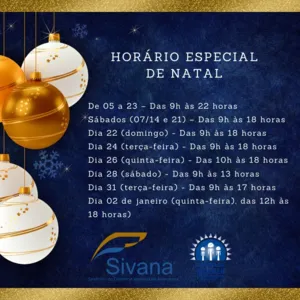 Na véspera do Natal, dia 24, o comércio ficará aberto das 9h às 18 horas. Dia 25, Natal, estará fechado, retomando o atendimento dia 26, quinta-feira, às 10 horas. O sábado, dia 28, o comércio funcionará das 9h às 13 horas; segunda-feira, dia 30, as lojas atenderão no horário convencional, das 9h às 18 horas.