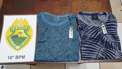 Durante a abordagem, os policiais encontraram camisetas que haviam sido furtadas da loja, e deram voz de prisão ao suspeito, momento em que ele passou a ficar agressivo e passou a investir contra os policiais com empurrões e chutes, além de xingamentos.