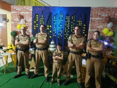 O menino Cauan Felipe completou 7 anos de idade e escolheu como tema da sua festa a Polícia Militar. Por essa razão, uma equipe do 10º BPM de Apucarana esteve presente para que o aniversariante e convidados pudessem interagir com os policiais e também tirar fotos.