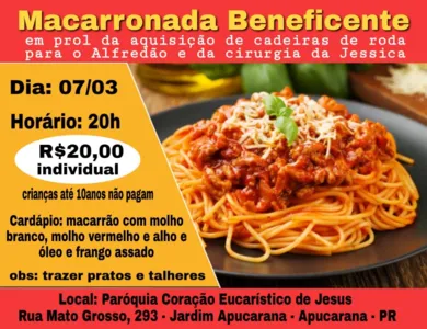 No dia 7, às 20 horas, acontece mais uma macarronada beneficente na Paróquia Coração Eucarístico de Jesus, em Apucarana. O evento é em prol do banco de cadeira de rodas do apucaranense Alfredão e também da cirurgia oftalmológica de uma jovem chamada Jéssica. Mais informações com Bia Usso pelo telefone (43) 9953-7232.