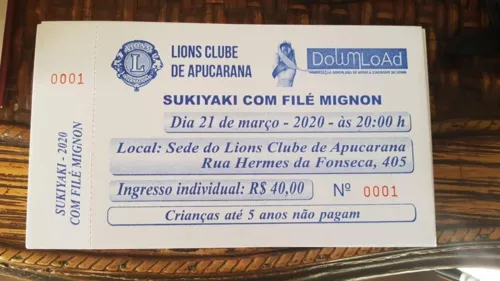 O Lions Clube de Apucarana e a associação DownLoad, de apoio à síndrome de down, de Apucarana, realizam sukiyaki com filé mignon no dia 21 de março, às 20 horas. O evento acontece na sede do Lions, localizada na Rua Hermes da Fonseca, 405. Crianças de até 5 anos não pagam.