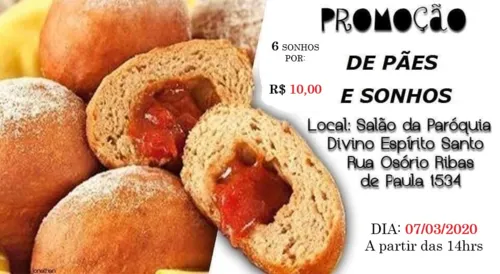 Acontece neste sábado (7), a partir das 14 horas, a tradicional promoção de sonhos e pães da Paróquia Divino Espírito Santo, em Apucarana. A atividade será realizada no salão paroquial, localizado na Rua Osório Ribas de Paula, 1537.