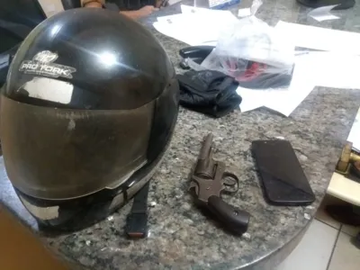 Com o rapaz foi encontrado um capacete e após a equipe realizar buscas, foi localizado um revólver prata, calibre .32.