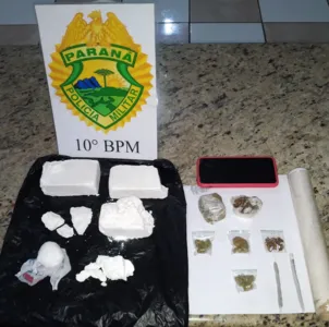 Os policiais encontram o suspeito no banheiro, tentando descartar algo. A PM localizou 750 gramas de cocaína, avaliada em mais de R$7 mil. A polícia também apreendeu 50 gramas de maconha, que estava no balcão da cozinha.