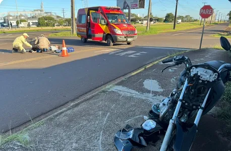 Um jovem de 23 anos ficou ferido após a colisão entre uma moto Honda CG 350 e um GM Corsa na Avenida Zilda Seixas do Amaral, próximo ao acesso ao Clube Água Azul, em Apucarana.