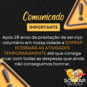 “É com muita tristeza que após 28 de anos de trabalho árduo em nossa cidade a SOPRAP ESTÁ SUSPENDENDO SUAS ATIVIDADES TEMPORARIAMENTE até que possamos honrrar com nossas despesas em clinicas parceiras que está no valor de R$ 30.000,00