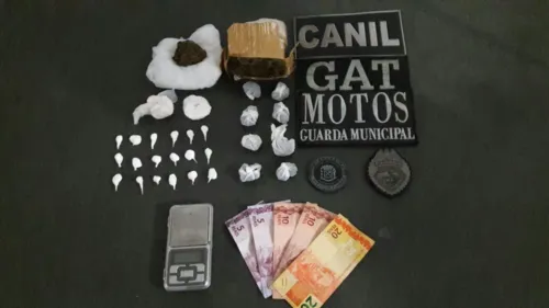 Com apoio do cão farejador Argos, os guardas encontraram 18 buchas de cocaína, 200 gramas de maconha, 8 buchas de maconha, balança de precisão, dinheiro e porções de maconha e cocaína não fracionadas.