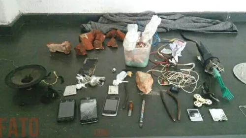 A polícia relatou que foram encontrados 3 telefones celulares, 7 invólucros de maconha, diversos fios, 3 pontas de ferroe até uma batedeira caseira que era utilizada como furadeira, e vários pedaços de tijolos retirados das paredes.