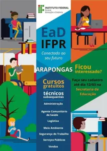 A Prefeitura Municipal de Arapongas, em parceria com o Instituto Federal(Paraná educação à distância), informa que iniciam a partir de hoje (26) as aulas dos cursos gratuitos técnicos subsequentes, nas áreas de: administração, agente comunitário de saúde, logística, meio ambiente, segurança no trabalho, serviços públicos e vendas, no auditório da Prefeitura Municipal, rua das garças,750 - centro.