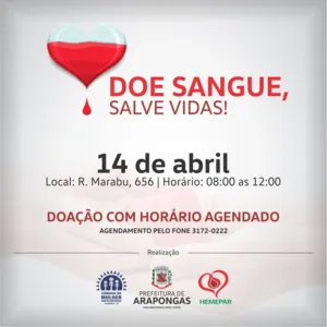 A Prefeitura Municipal de Arapongas, através da Secretaria de Saúde, em parceira com a Câmara da Mulher Empreendedora e Hemonúcleo de Apucarana, vai realizar neste sábado (14), a campanha “Doe sangue, salve vidas”.