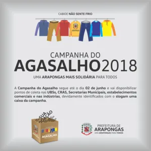 A Prefeitura Municipal de Arapongas, através da Secretaria de Assistência Social, reforça a Campanha do Agasalho 2018, que tem como slogan: – “Cabide Não Sente Frio”. Ação segue até o dia 28/07/2018, data em que será realizado o "Dia D" da campanha, no pátio da Igreja Matriz, às 09:00 horas.