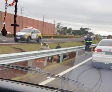 Um acidente registrado no começo da manhã desta quarta-feira (05) deixou um policial militar (PM) ferido. O apucaranense seguia sentido Arapongas, quando perdeu a direção da moto em frente à empresa Nortox e caiu na canaleta central na BR-369.