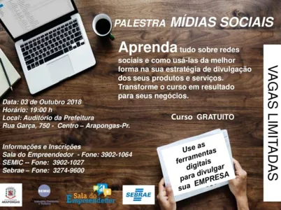 Uma parceria entre a Secretaria de Indústria e Comércio (Semic) de Arapongas e o Sebrae, promove de maneira gratuita o curso “Mídias Sociais – como utilizar para divulgação de sua empresa”. A primeira edição dessa ação será realizada no auditório da Prefeitura Municipal, situado na Rua Garças, 750 – centro, no dia 03 de outubro às 19h.