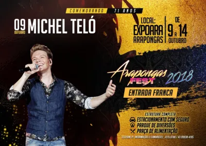 O Arapongas Fest 2018 acontece de 9 a 14 de outubro, no Centro de Eventos Expoara, e levará ao público shows gratuitos de artistas renomados, além de outros atrativos, como parque de diversões, praça de alimentação, amplo estacionamento e segurança reforçada.