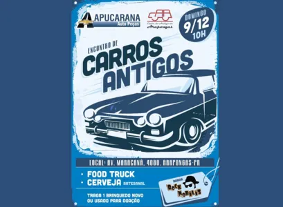A Apucarana Auto Peças vai realizar neste domingo (09) em Arapongas um Encontro de Carros Antigos. O evento vai contar ainda com food trucks, cervejas artesanais, e som ao vivo.
