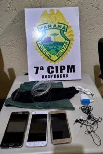 Ao ver a viatura policial, mudaram bruscamente o sentido e começaram a andar depressa. A equipe policial deu voz de abordagem aos suspeitos, e com eles, localizou três celulares enrolados em um pano, além de um carregador e um fone de ouvidos.