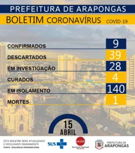 Arapongas investiga 28 casos suspeitos do novo coronavírus. A informação foi confirmada na tarde desta quarta-feira (15), em boletim divulgado pela Prefeitura Municipal. Outros 39 casos investigados foram descartados.