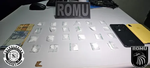 Durante a revista pessoal, os agentes localizaram com o motorista um pacote escondido em sua roupa íntima, contendo 22 porções de substância análoga à cocaína, já fracionadas para a venda. No console do carro, foi encontrada mais uma porção da droga, além de R$ 102,00 em dinheiro e dois aparelhos celulares. Com o passageiro, nada de ilícito foi encontrado.