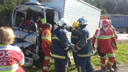 O acidente aconteceu próximo à praça de pedágio de Palmeira, sentido Curitiba. Um caminhão bateu na traseira de outro e, com o impacto, o motorista ficou preso na cabine.