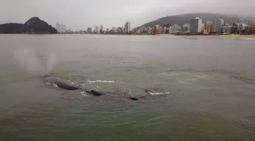 Duas baleias foram flagradas na manhã destas segunda-feira (20) no mar de Matinhos no litoral do Paraná (PR). Os animais nadavam próximo à costa, e pode ser observado por estudiosos e algumas pessoas.