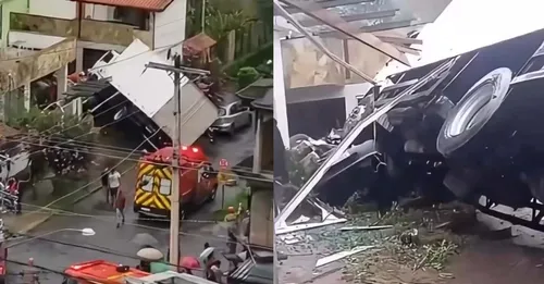 Nesse momento, um caminhão desgovernado desceu pela rua, atingiu e arrastou o veículo da família e só parou após colidir com a fachada de uma residência.