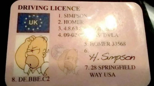 Uma inglesa parada em blitz da polícia em Buckinghamshire (Inglaterra), nesta semana, entregou aos agentes simplesmente a carteira de motorista do Homer Simpson, personagem de desenho animado.