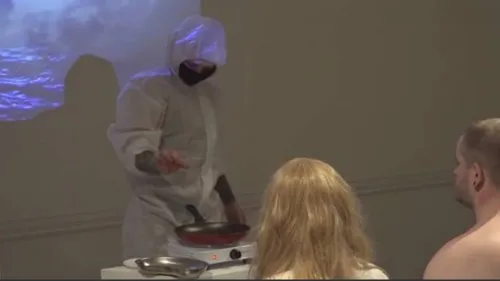 Uma performance artística na Letônia teve um detalhe bizarro: carne humana frita. A cena canibal criada por Arthur Berzinsh foi apresentada no Museum LV un Grata JJ, situado em Riga, capital do país.