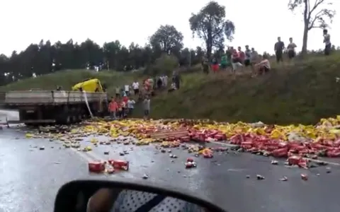 Caminhão carregado com cerveja tomba e é saqueado na BR-277